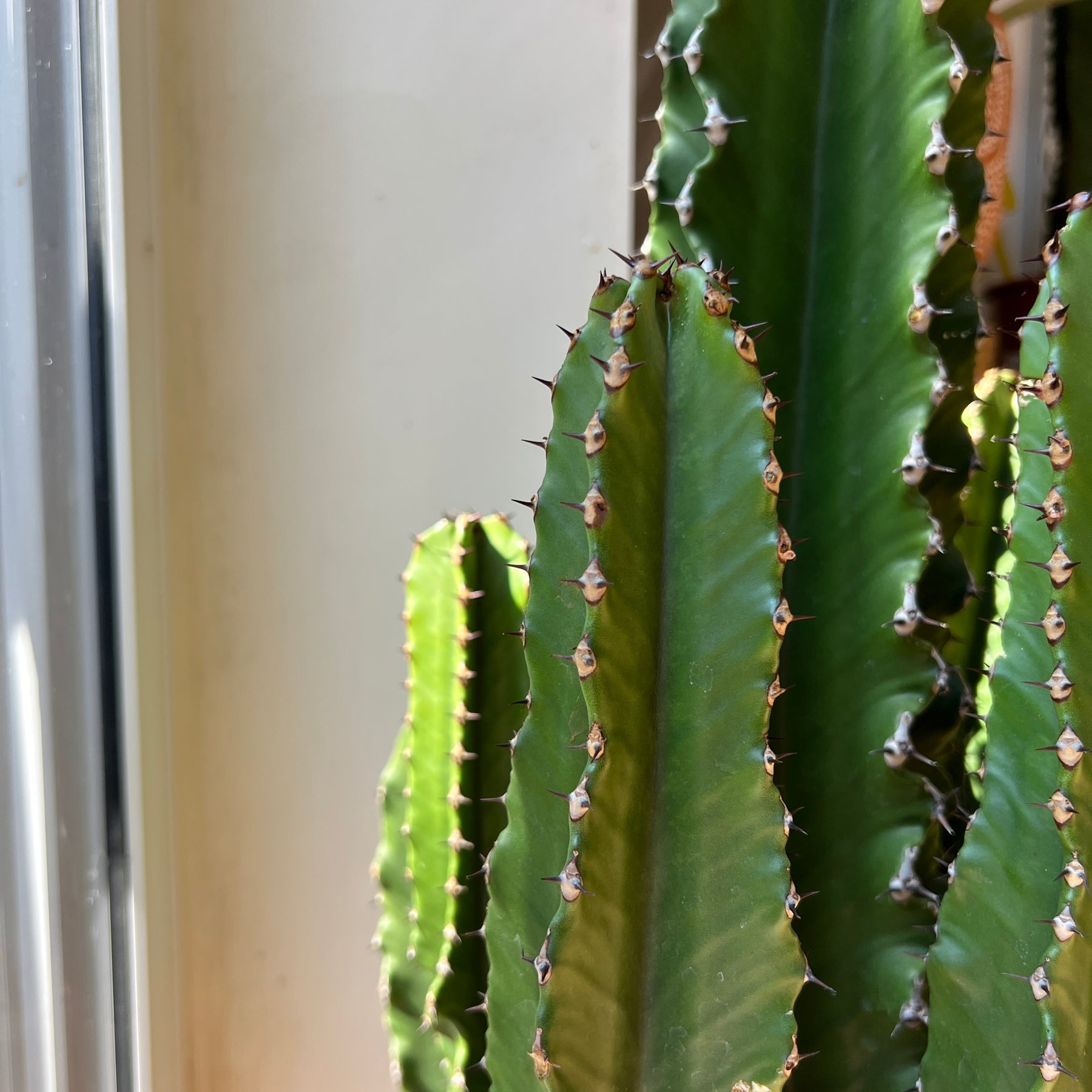 Euphorbia abyssinica, often called the Desert Candle Cactus or Abyssinian Euphorbia, is a striking, tree-like succulent with tall, upright, columnar stems and prominent ridges lined with small spines. Its architectural form and rich green colour make it a statement plant indoors or out (in warmer climates). Despite its cactus-like appearance, it’s actually a succulent in the Euphorbia family, storing water in its stems to survive long dry spells.