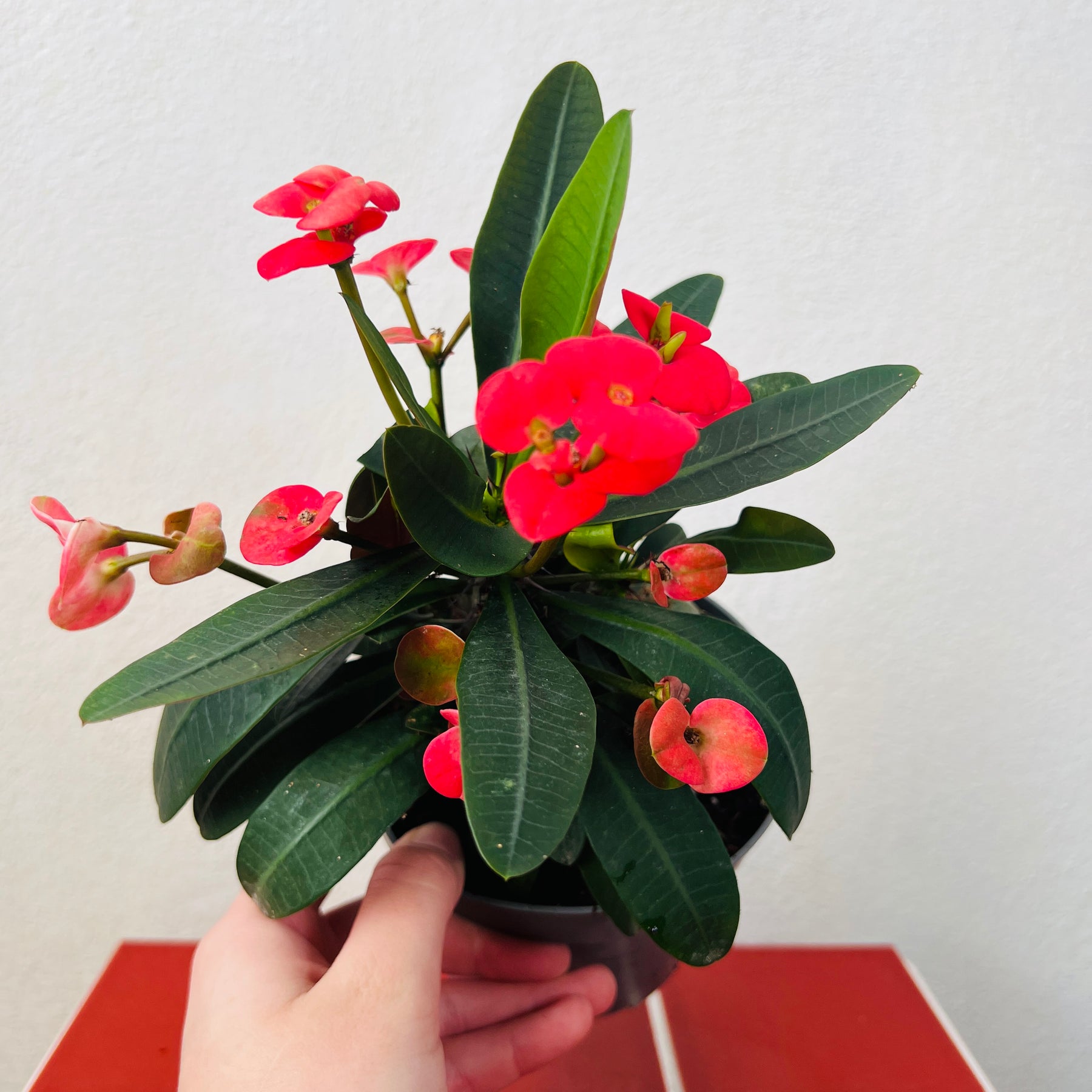 Spiky, sweet, and unapologetically tough—Euphorbia milii 'maxi Olympia' charms with soft pink flowers that bloom for months on end, even in dry conditions. A sunny windowsill star with a no-nonsense edge.
