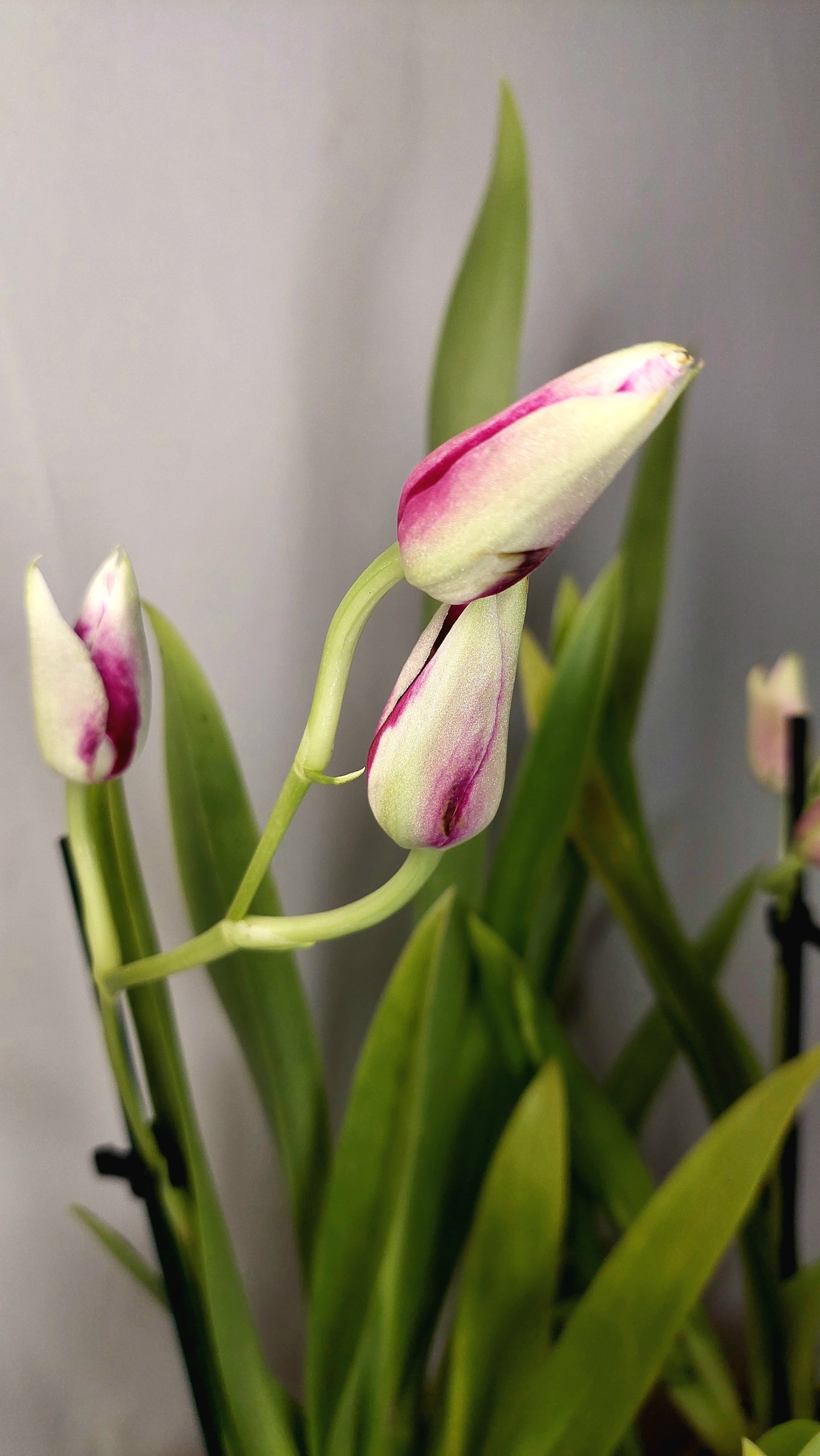 Watering: The key to understanding watering needs is to observe the roots. Silvery white means it needs water, and green means it is saturated. You can water your orchid by soaking it for about 10 minutes or running water over the plant for about 15 seconds. With either method, ensure the water has completely drained from the pot before placing it back in its container. Generally, you are looking at watering about every ten days or so in winter and more frequently when temperatures warm up.