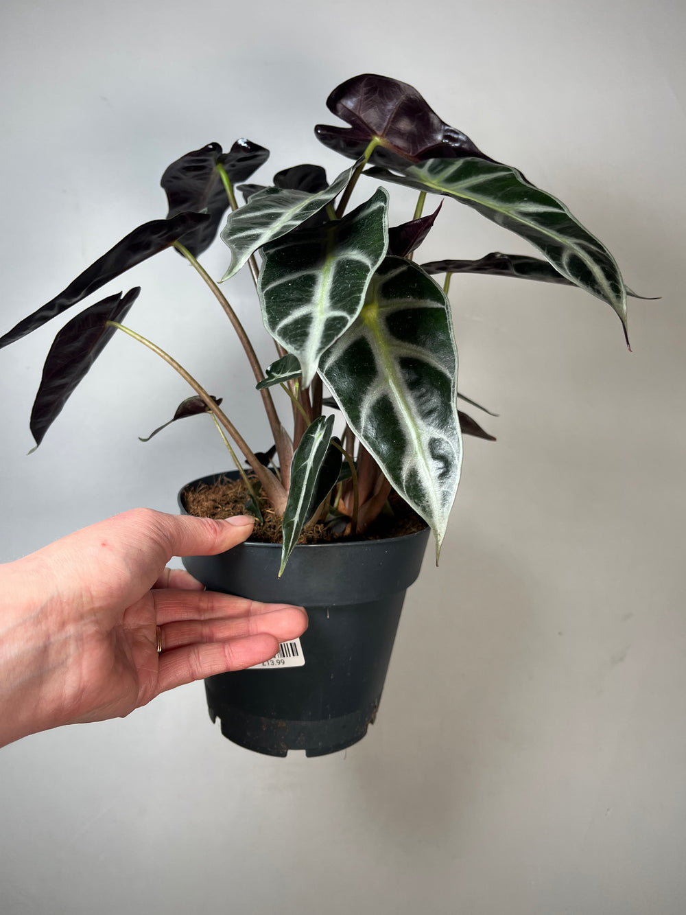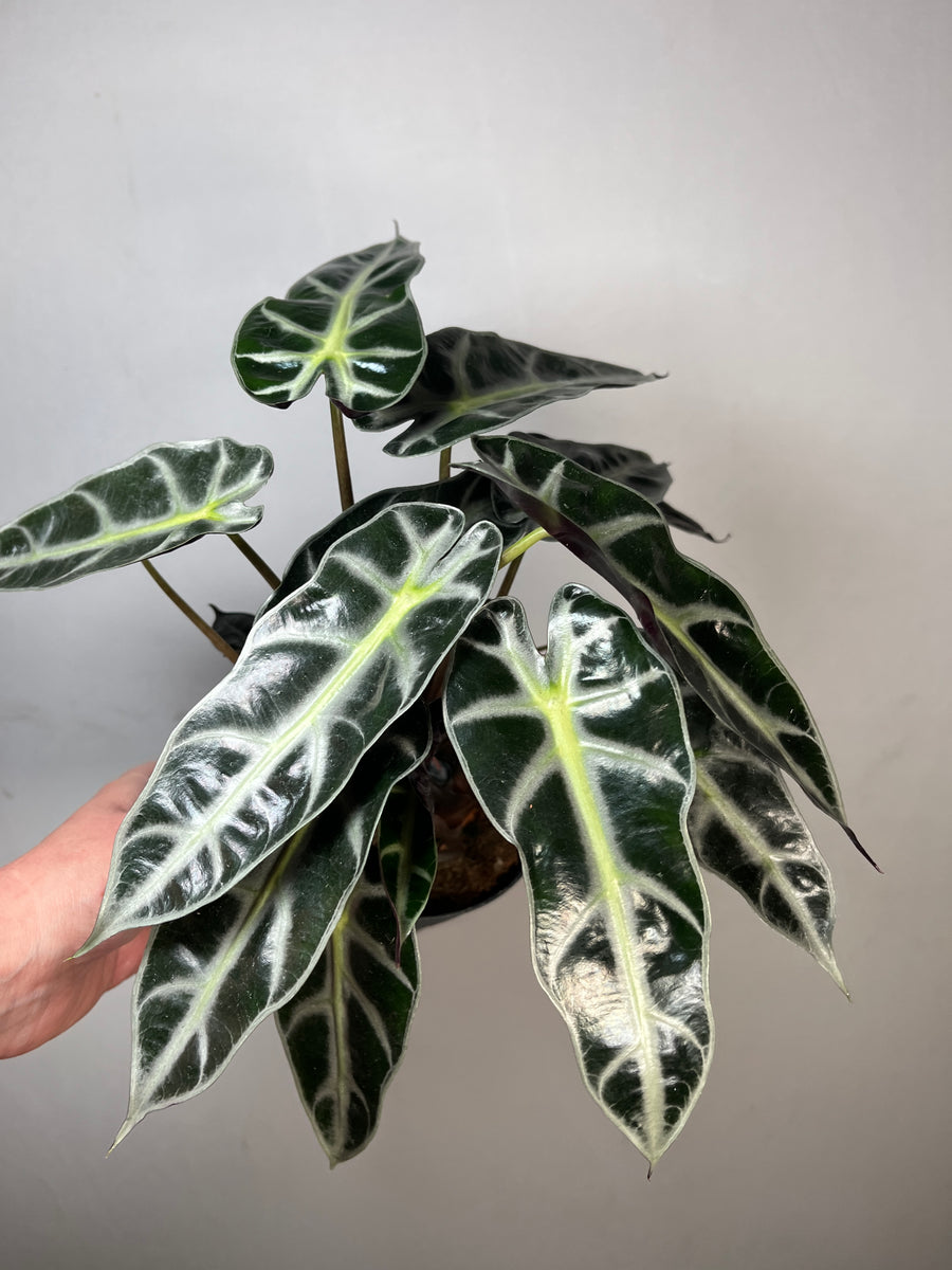 Sharp lines, glossy leaves, and rich contrast—Alocasia ‘Bambino Arrow’ is the edgy little sibling in the alocasia family. It’s compact, sculptural, and low-key dramatic in all the right ways.