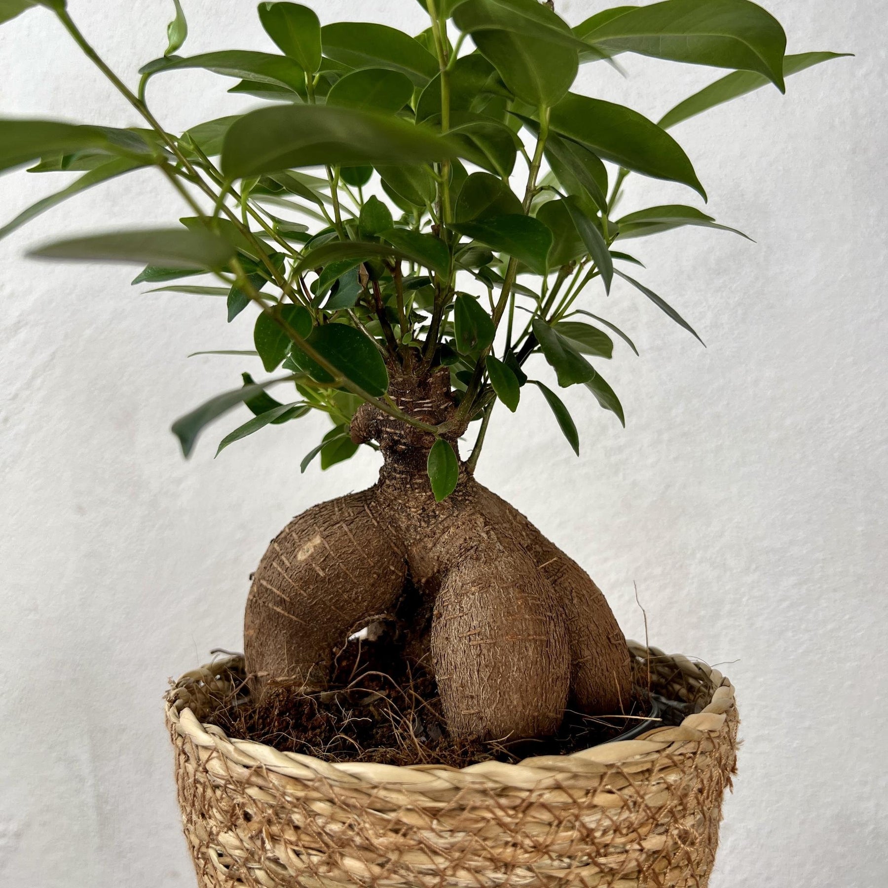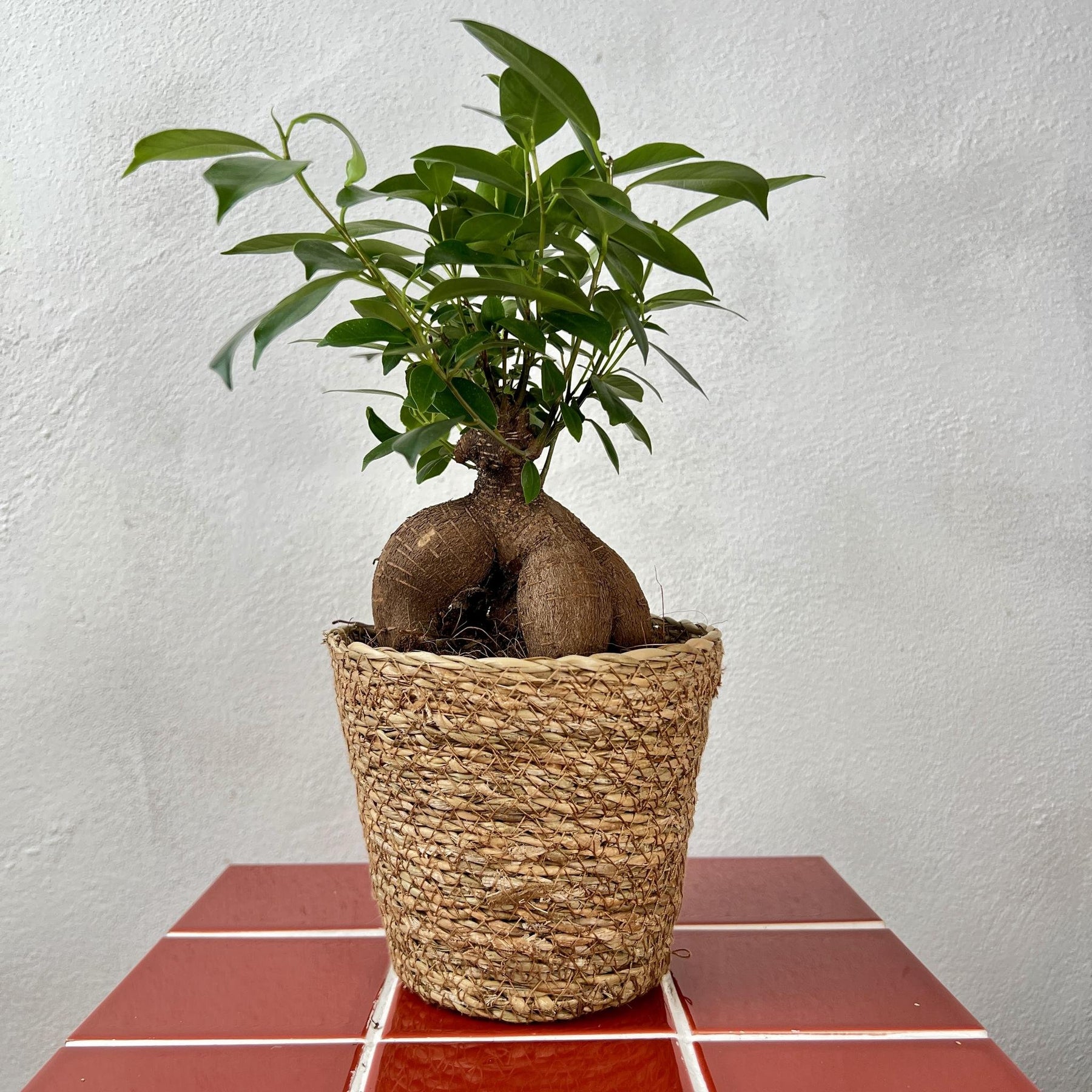 Bring natural warmth and tranquility into your home with our Ficus microcarpa Bonsai Ginseng Fig paired with the Terima Basket Natural Seagrass Planter. The bonsai's sculptural indoor tree form and glossy green leaves make it a statement piece, while the handwoven seagrass basket adds a touch of eco-friendly elegance. Easy to care for and perfect for beginners, this bundle is a timeless favorite for plant lovers. The basket fits nursery pots up to 14cm and is ethically made under the Terima Kasih Fair & Responsible standards, making it a perfect pairing for your indoor plant display.
