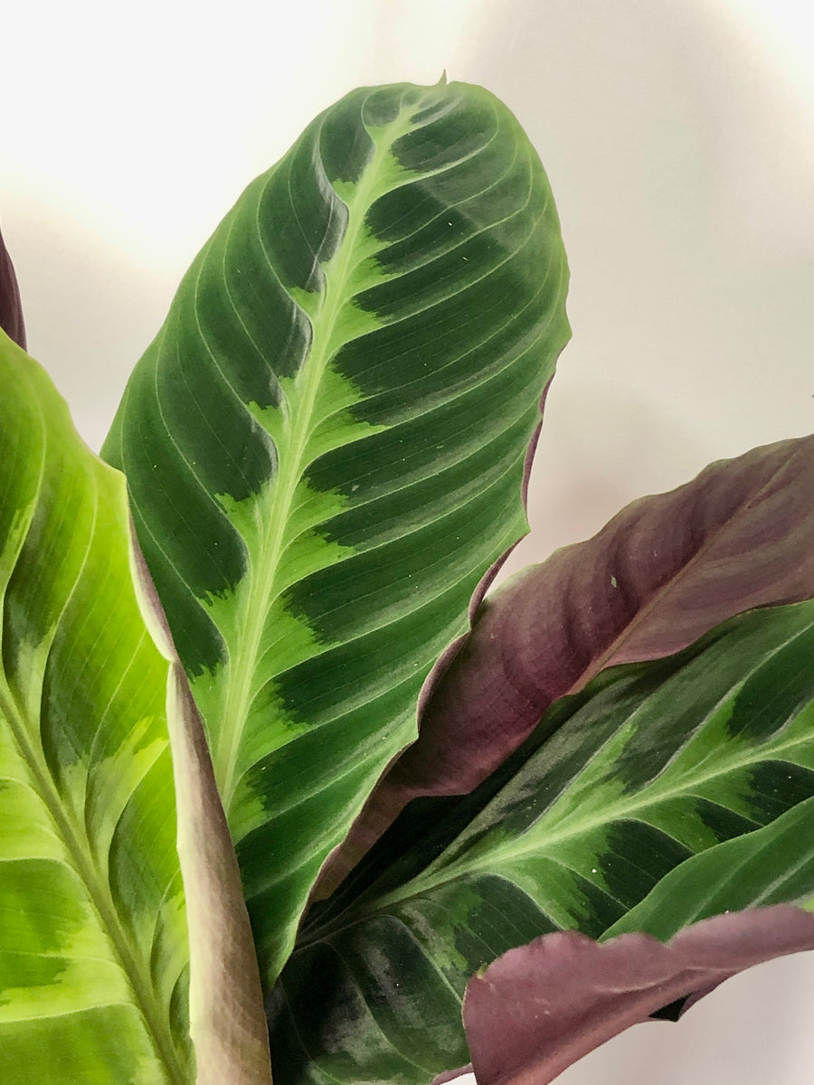 Calathea warscewiczii, also known as the Jungle Velvet Calathea, brings serious drama with its velvety deep green leaves and bold pale veining. Flip those leaves over and you'll find rich purple undersides — this plant is a full-on mood. Native to Central America and perfect for shady corners, it thrives with a bit of humidity and a lot of admiration.