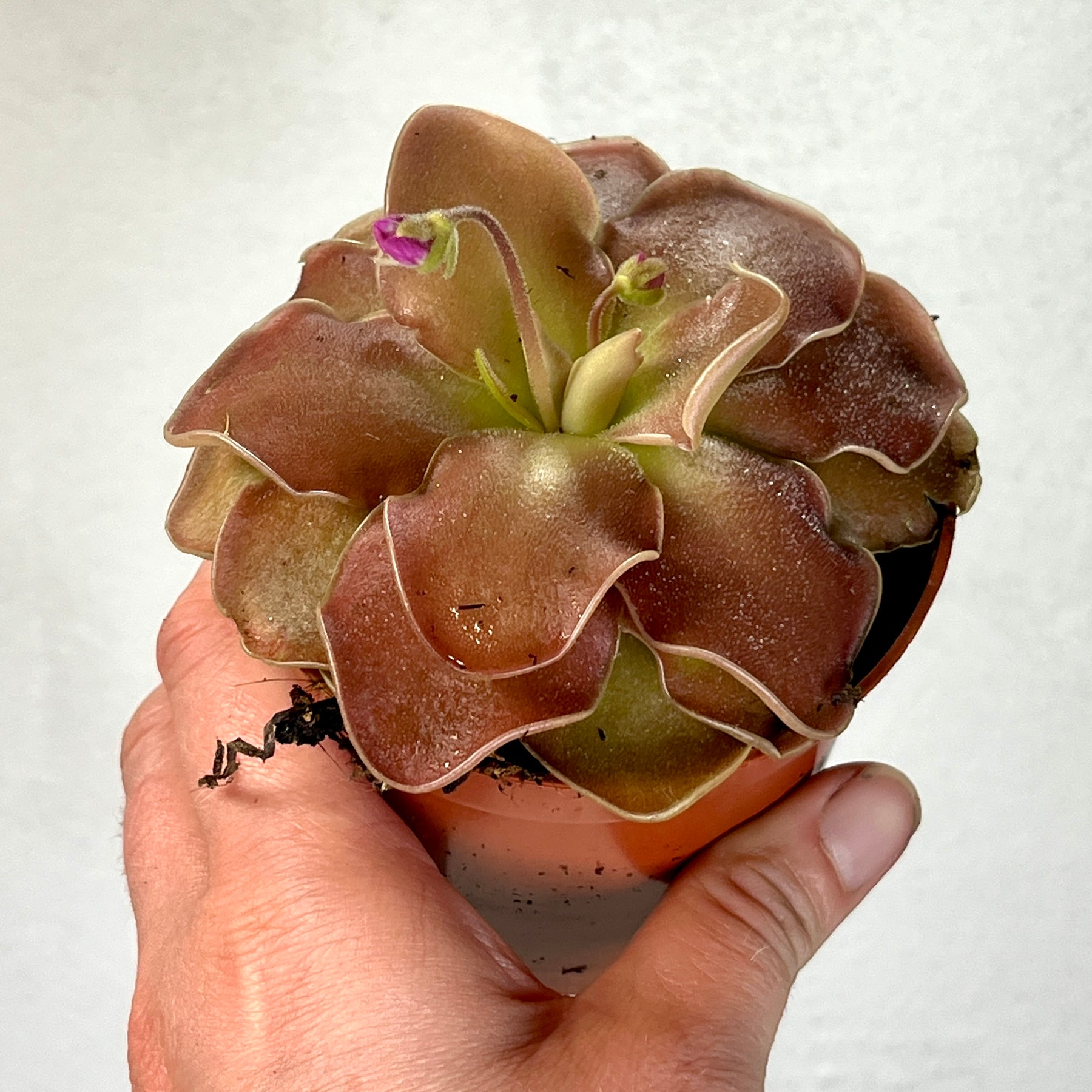 This subtropical Pinguicula hybrid is a little rosette superstar — fleshy, compact, and known for bursting into clusters of bright cerise-pink flowers. Throughout the growing season, it’s a moisture-loving fly-catcher. Come winter, it quietly tucks into a smaller resting form, needing just a bit of a breather (don’t we all?). Perfect for a north-facing windowsill or anywhere that’s bright but out of harsh sunlight, it’s both low-fuss and highly rewarding.