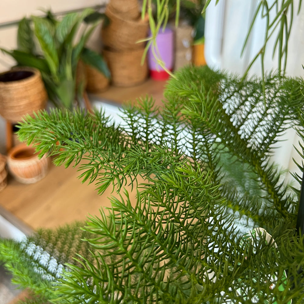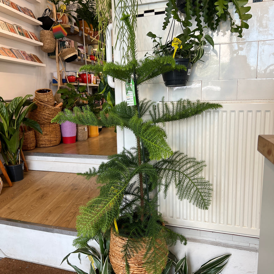Araucaria heterophylla, also known as the Norfolk Island Pine, is a graceful evergreen conifer with tiered, feathery branches that bring instant architecture to any space. Despite its name, it’s not a true pine, but it makes a brilliant indoor tree — especially around the festive season when it can double as a natural Christmas tree. Outdoors in warmer climates it can grow huge, but indoors it stays a charming, long-lived statement piece.
