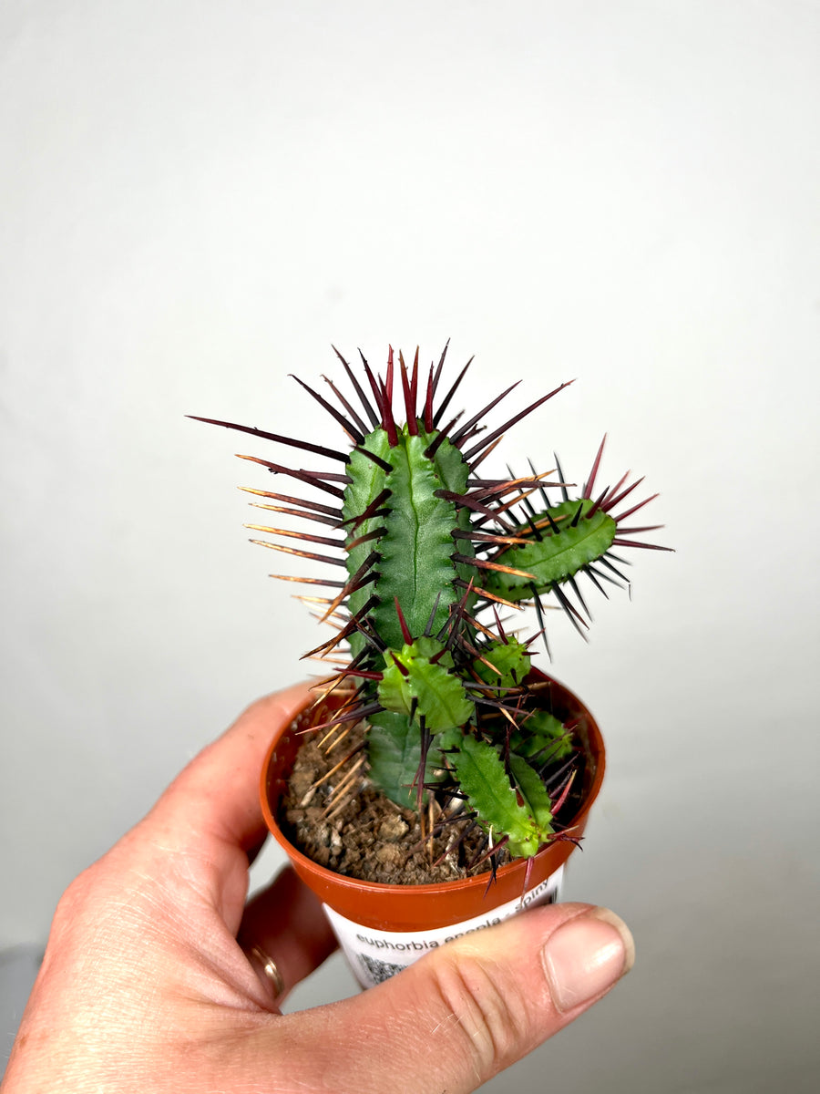 Euphorbia sap is toxic and can be irritating to skin—avoid contact when repotting or pruning. Wear gloves just to be safe. This spiny friend also appreciates being rotated every so often to grow evenly.