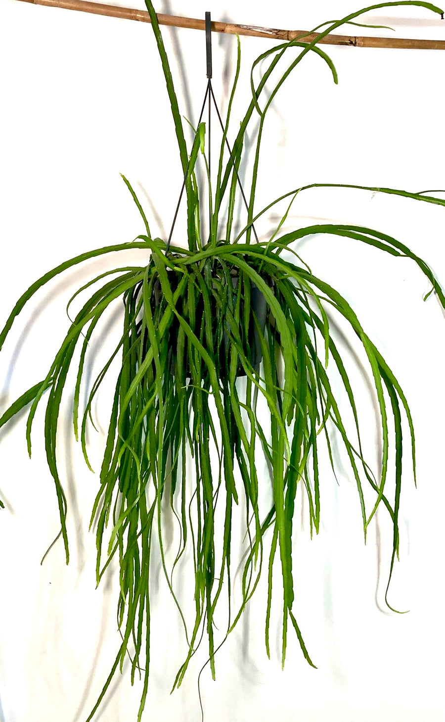 Rhipsalis boliviana (also known as Lepismium bolivianum) is an unusual, trailing jungle cactus with long, flat, leaf-like stems that cascade elegantly as it matures. Native to the cloud forests of Bolivia, this epiphytic plant brings a lush, architectural feel to your space. Its segmented stems can develop pinkish edges in brighter light, and in the right conditions, it may produce delicate, star-shaped flowers followed by small ornamental fruits. A striking choice for hanging planters or high shelves where it can really show off its draping habit.