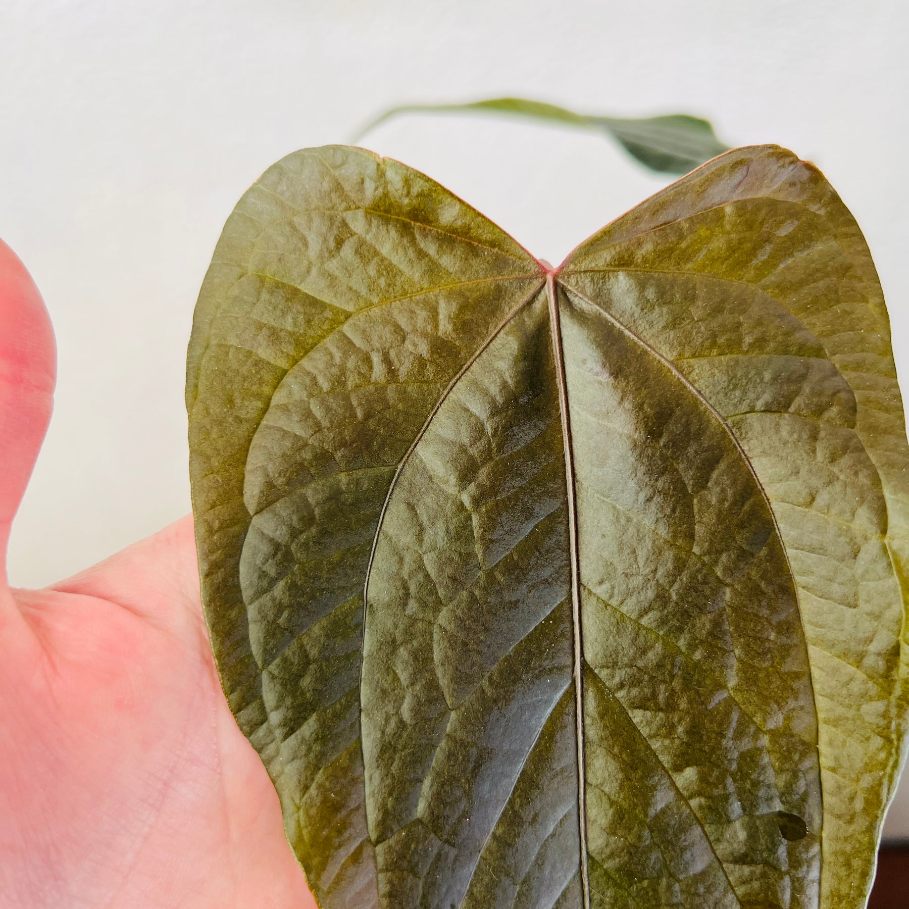 Anthurium ‘Queen of Hearts’ is a dramatic foliage anthurium known for its deep, velvety leaves and bold heart-shaped form. With rich, dark green to near-black foliage and subtle, elegant veining, this cultivar has a moody, luxurious presence that instantly elevates a space. It’s a slower-growing, collector-style anthurium that rewards patience with increasingly large, sculptural leaves. A perfect choice for those who love statement plants with a refined, slightly gothic edge.