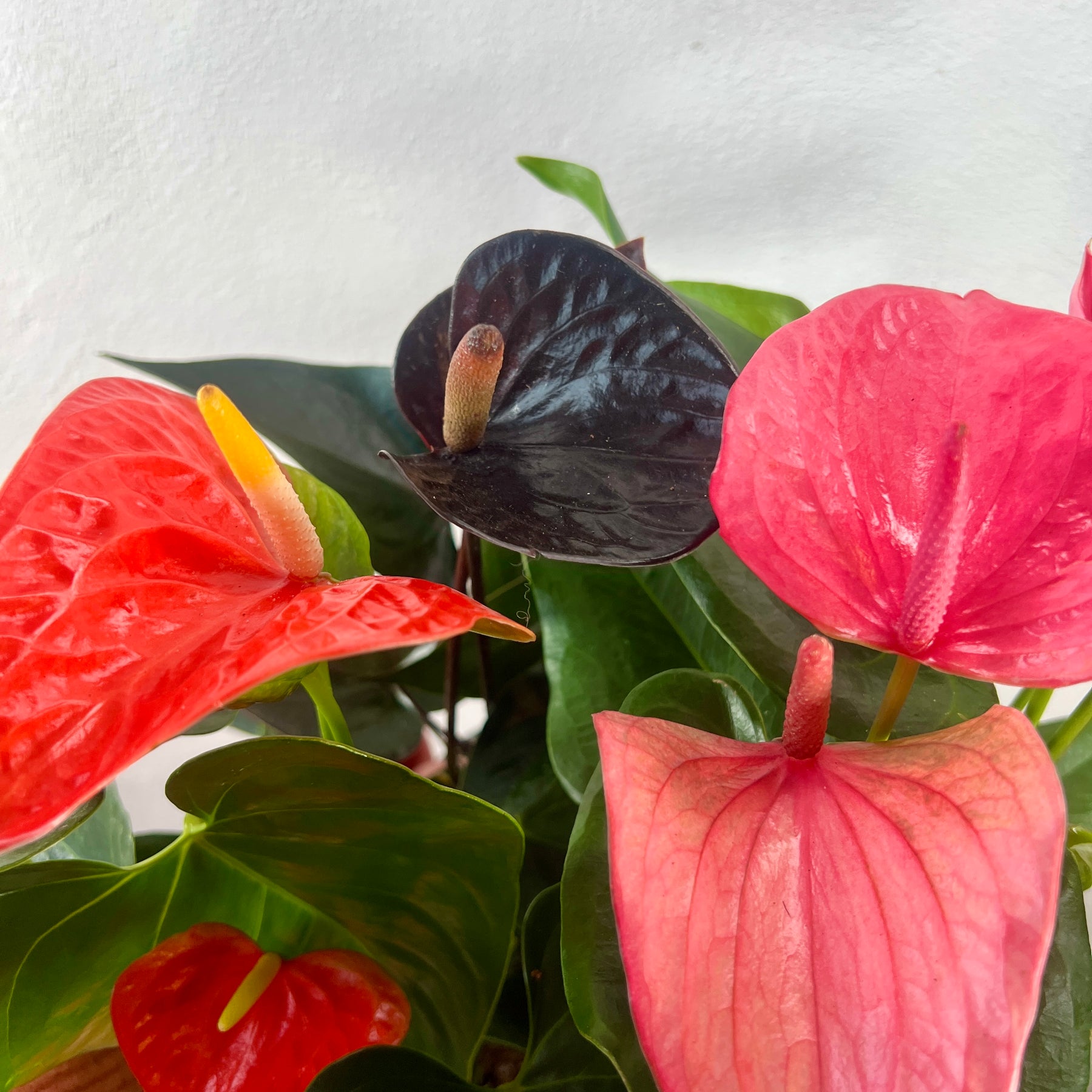 A vibrant selection of Anthuriums, loved for their glossy heart-shaped leaves and long-lasting, colourful blooms. Each mix features unique varieties that bring instant tropical style to any room — perfect for bright spots that need a pop of colour.