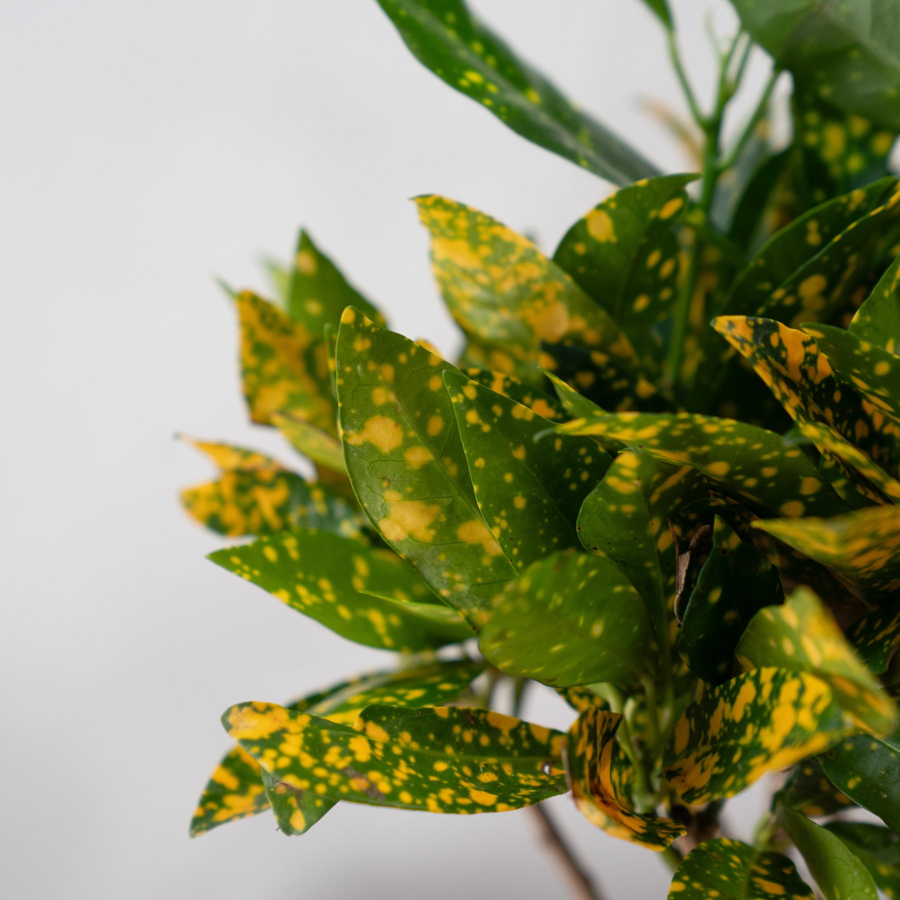 Codiaeum KL ‘Gold Sun’, also known as a Croton, is a bold houseplant prized for its striking golden-yellow and green leaves. This compact variety brings a burst of tropical sunshine indoors, making it a natural focal point for any bright room. Crotons are known for their vivid variegation, and ‘Gold Sun’ lives up to its name with luminous tones that glow when placed in strong light.