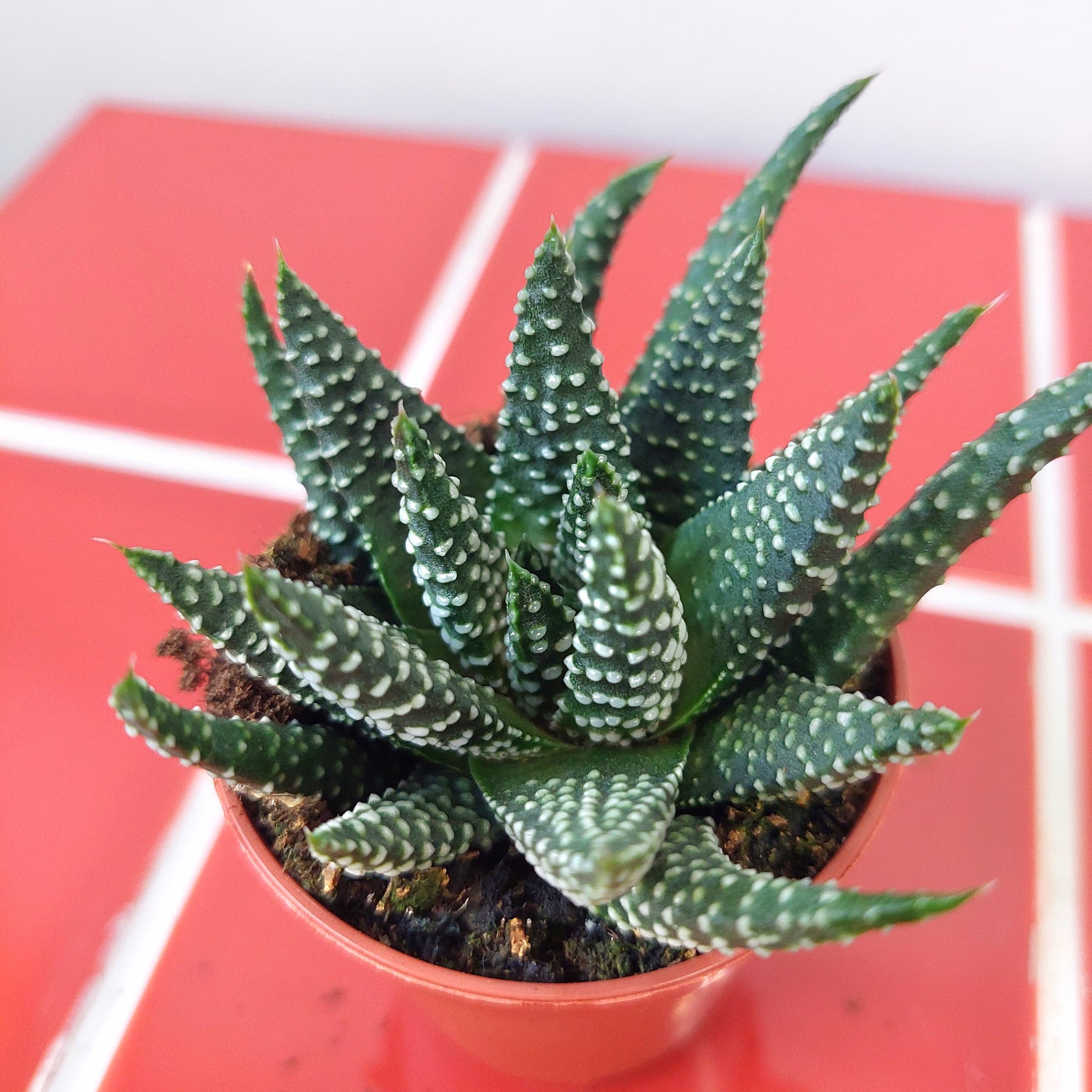 Charming, compact, and beautifully patterned, the Haworthia margaritifera (commonly known as the Pearl Plant) is a hardy little succulent that looks like a miniature aloe dotted with raised white “pearls” across its dark green leaves. Its rosette shape and easy-going nature make it ideal for small pots, terrariums, or desks. A perfect choice for anyone who wants a sculptural plant that thrives on neglect.