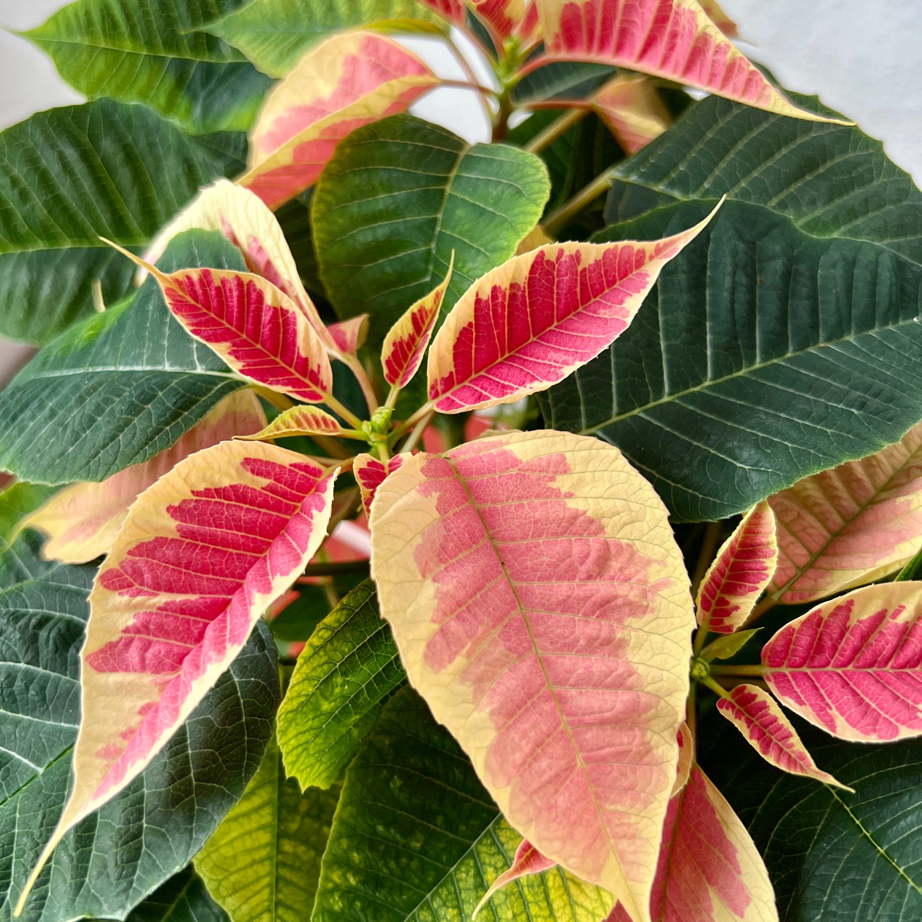 A UK-grown twist on the festive classic. These two-tone poinsettias bring soft marbled bracts in cream, blush, and pink for an elegant, cheerful pop of colour. Fresh, vibrant, and grown right here in Britain for longer-lasting holiday magic.
