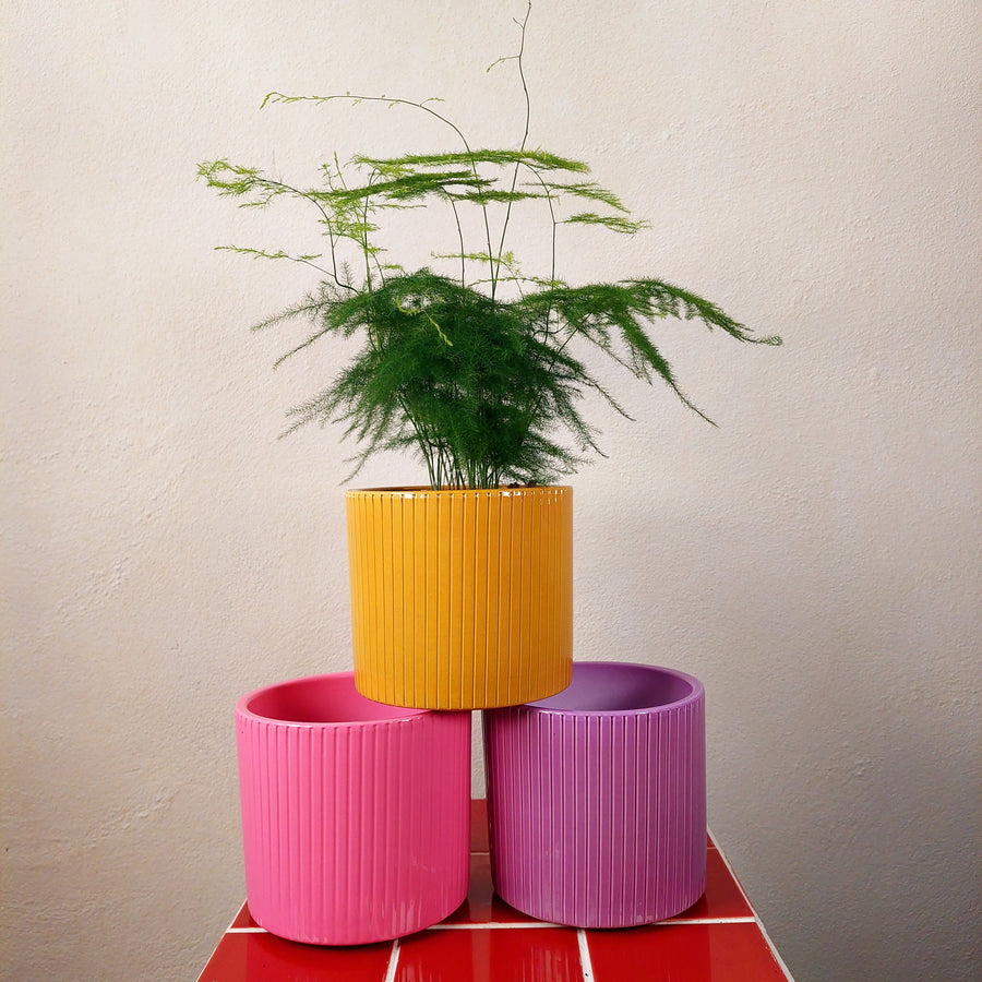 Era Ribbed Ceramic Pot – Pink / Lilac / Mustard | D13.5 × H12.5 cm