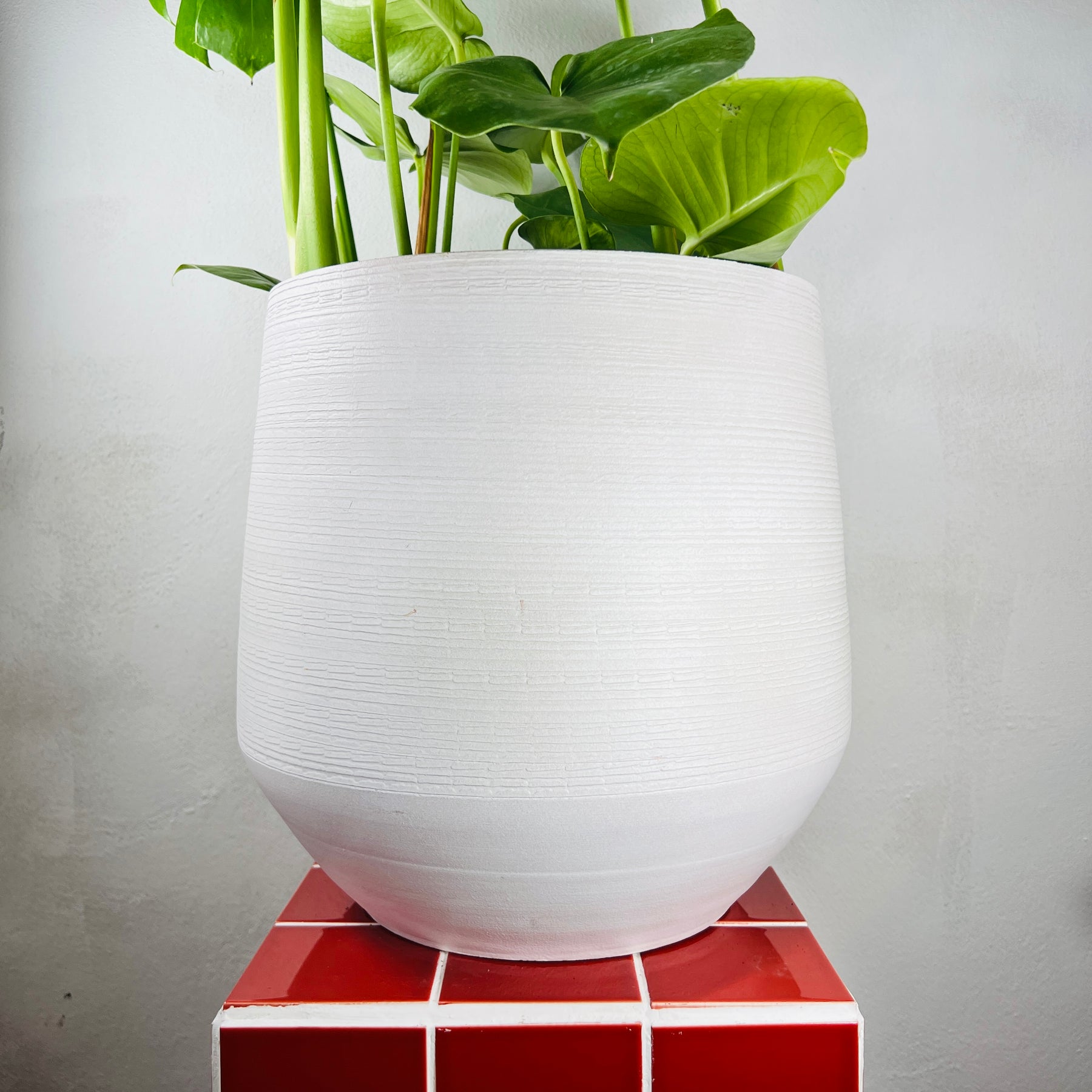 Its large size makes it perfect for floor displays, and the lack of drainage makes it an ideal cover pot for nursery pots — no mess, just style.