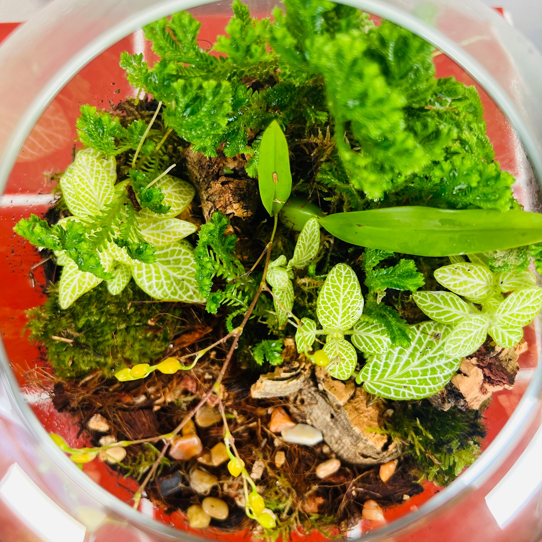 Made in-house and unique, the Golden Forest terrarium is made with high-quality, eco-friendly glass. Caring for your terrarium is super easy- provide bright, indirect light and watch it grow! Watering is generally not required as they are an enclosed ecosystem; however, trimming may be necessary in the future. All terrariums come with a care leaflet.