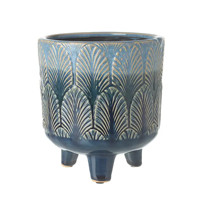 A little elevation goes a long way. The Blue Leaf Leggy Pot stands tall on three little legs, lifting your plant just enough to make it a star. Measuring 16cm wide and 17.5cm high, it’s finished in a glossy indigo glaze and carved with lush, layered leaf patterns for a textured look that catches the light beautifully. Made for 12–17cm nursery pots and perfect for shelves, consoles, or anywhere that could use a bit of lift. No drainage hole.