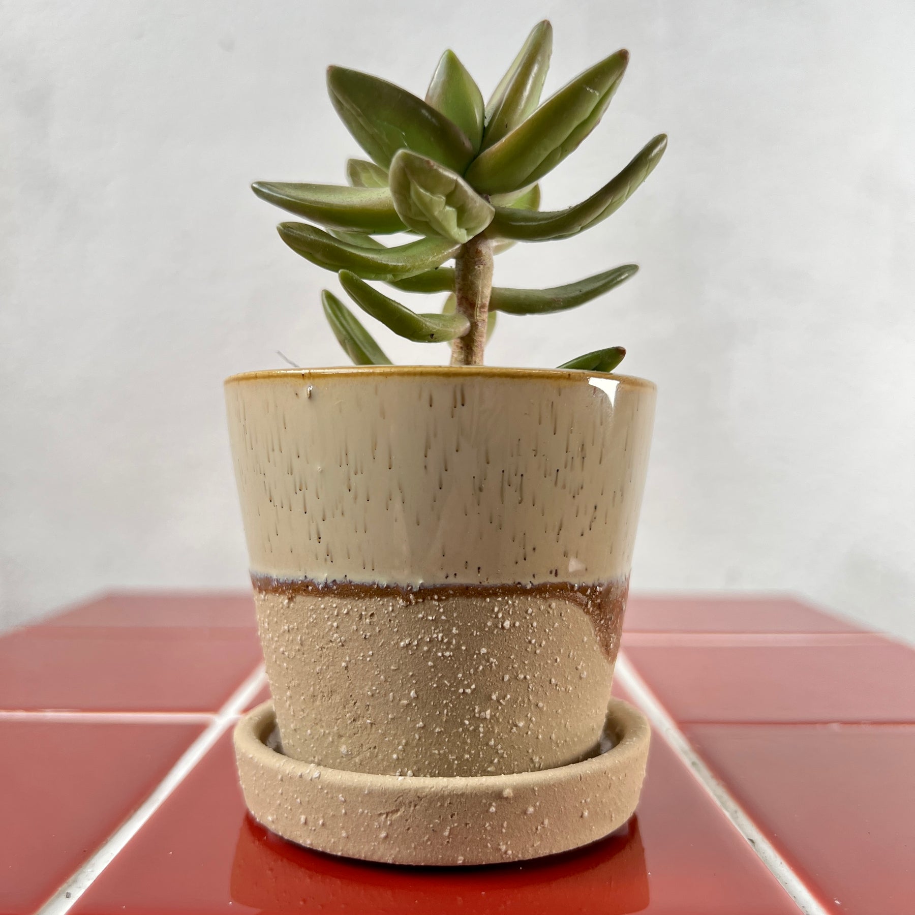 A warm, modern ceramic pot featuring a soft speckled beige glaze with natural variation and a matching saucer. The subtle two-tone design adds calm, earthy charm to any space while keeping things practical – the built-in saucer helps protect surfaces from excess water.