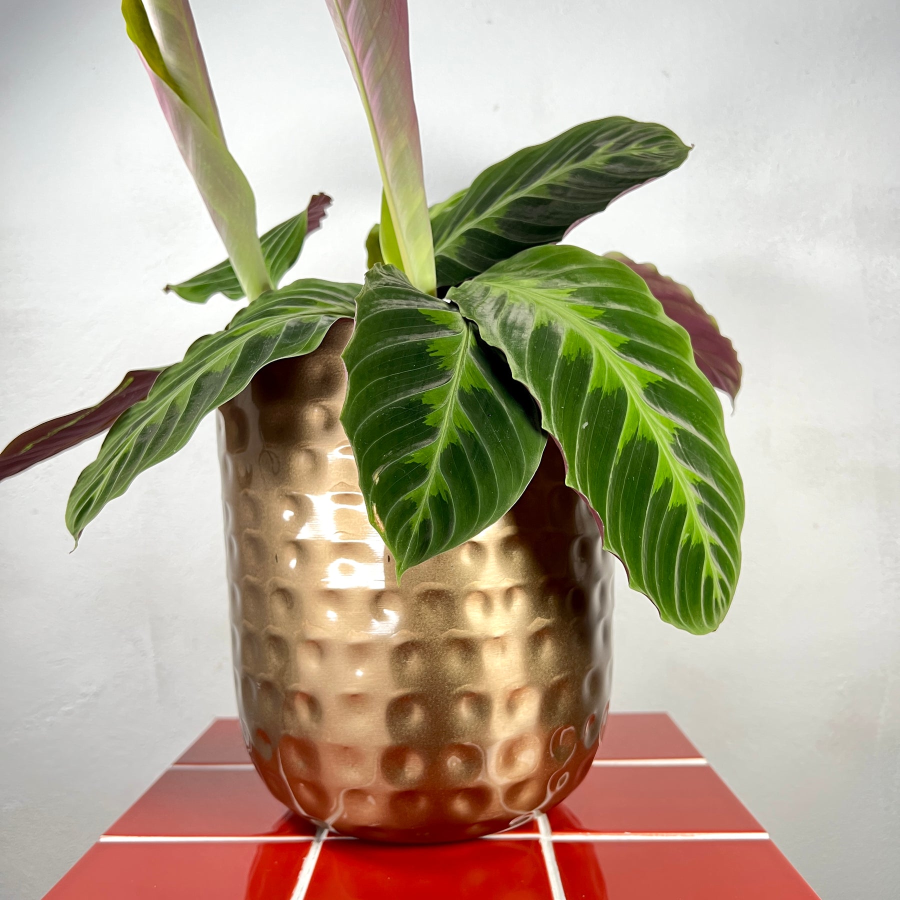 Bring a touch of luxury to your plant styling with the Mayren Hammered Gold Pot. Crafted from lightweight metal with a warm gold finish, this pot adds instant elegance to any space. The subtle hammered texture gives it depth and character, making it a striking accent piece for your favourite indoor plants.