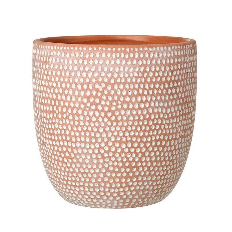 Playful but grounded, the Terracotta Dot Pot features a hand-speckled surface of raised white dots across a warm terracotta base. With a softly rounded shape and subtle texture, it’s an easy way to add charm to any plant corner. Fits standard 12-14cm nursery pots like a dream. No drainage hole.