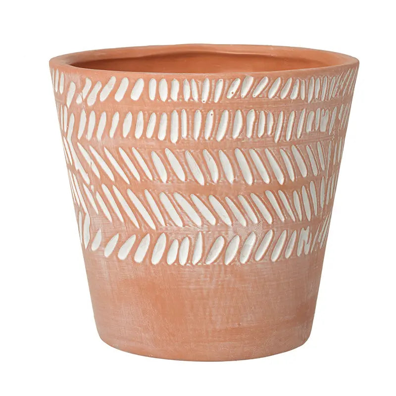 With a warm terracotta finish and white etched zigzag pattern, the Terracotta Zigzag Pot is equal parts earthy and eye-catching. Its softly tapered shape and hand-carved vibe give it an artisan feel—perfect for shelves, windowsills, or anywhere your plants like to show off. Available in two sizes: the small pot fits up to a 9cm nursery pot, and the large holds pots up to 12cm. Light, playful, and packed with texture. No drainage hole.