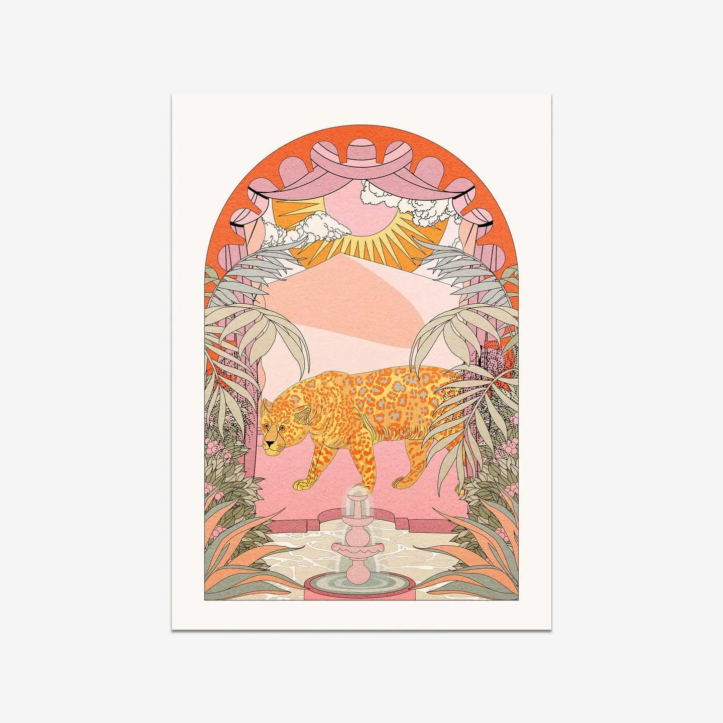 Orange toned boho style print featuring a prowling jaguar behind a water fountain and botanical plants and sun and mountain scene in the background. Print only, frame not included.