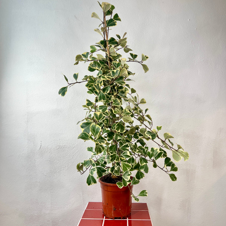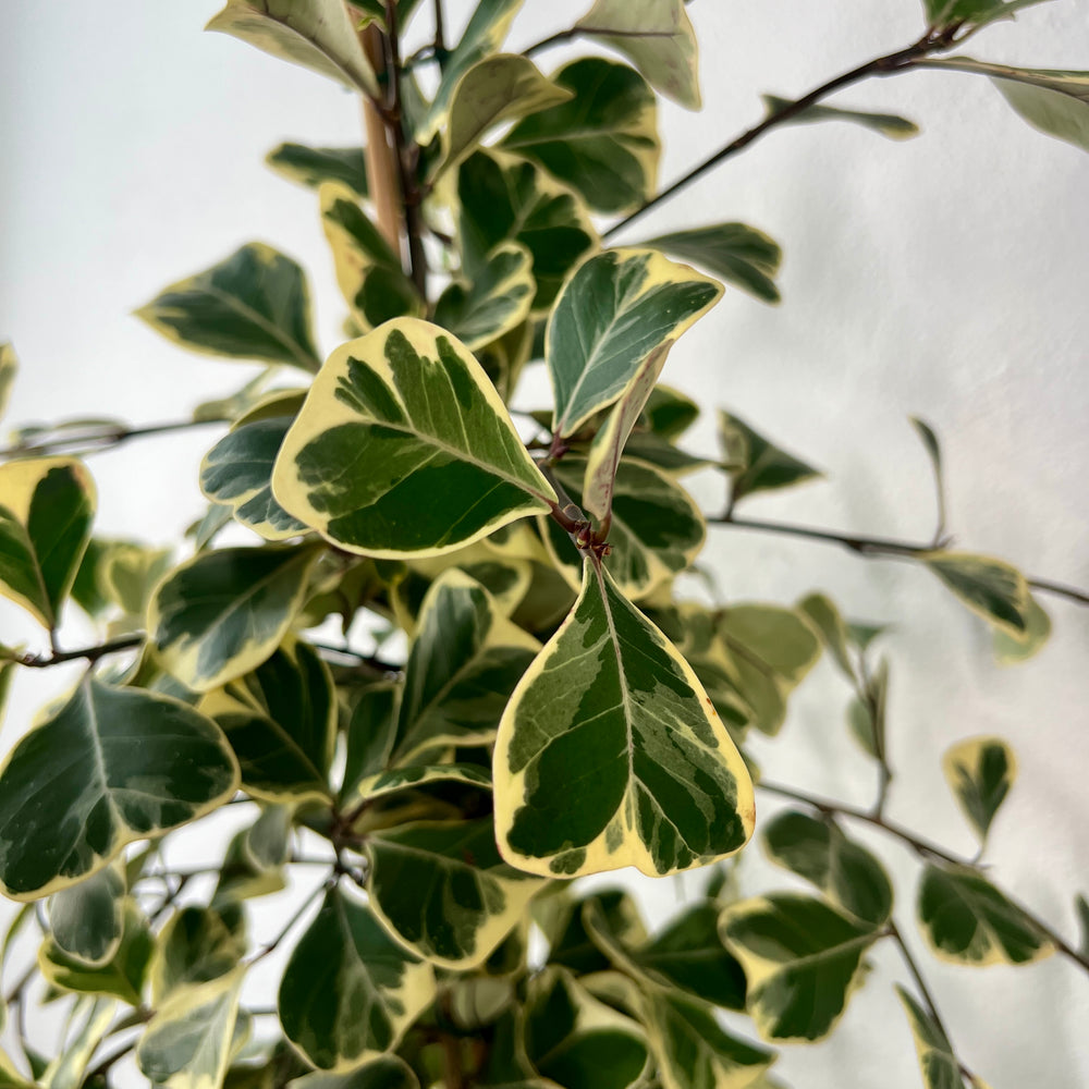 Ficus triangularis ‘Sweetheart’ is a charming, rare Ficus with small, heart-shaped leaves edged in creamy white variegation. Its compact growth habit and glossy foliage make it an elegant choice for shelves, desks, or as a small statement plant. Slower growing than the Rubber Plant or Fiddle Leaf Fig, this variety stays neat and manageable while still bringing that classic Ficus look.