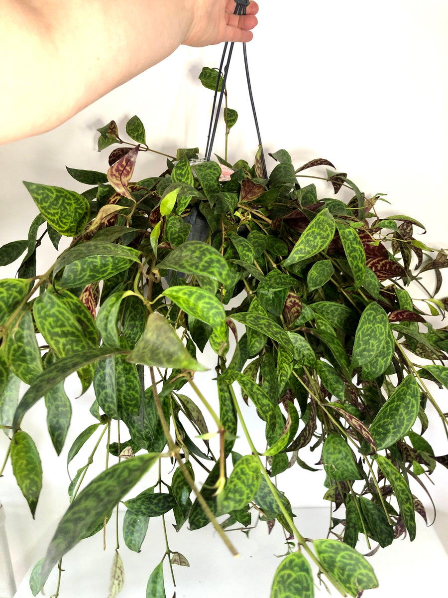 This one's all about the pattern. Aeschynanthus marmoratus, also known as the Zebra Basket Vine, is a trailing beauty with striking marbled foliage—deep green leaves streaked with lime-green veining, like a zebra in jungle camouflage.