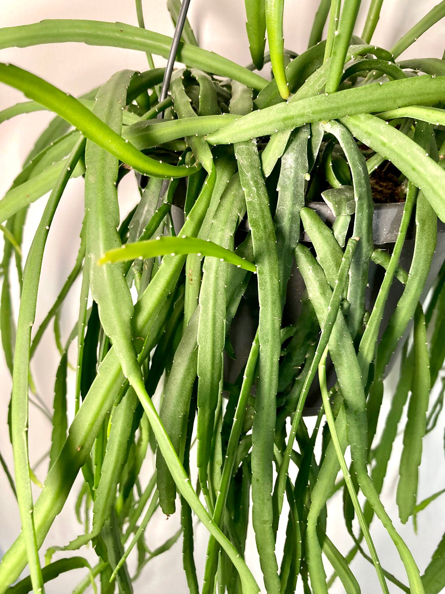 Rhipsalis boliviana (also known as Lepismium bolivianum) is an unusual, trailing jungle cactus with long, flat, leaf-like stems that cascade elegantly as it matures. Native to the cloud forests of Bolivia, this epiphytic plant brings a lush, architectural feel to your space. Its segmented stems can develop pinkish edges in brighter light, and in the right conditions, it may produce delicate, star-shaped flowers followed by small ornamental fruits. A striking choice for hanging planters or high shelves where it can really show off its draping habit.