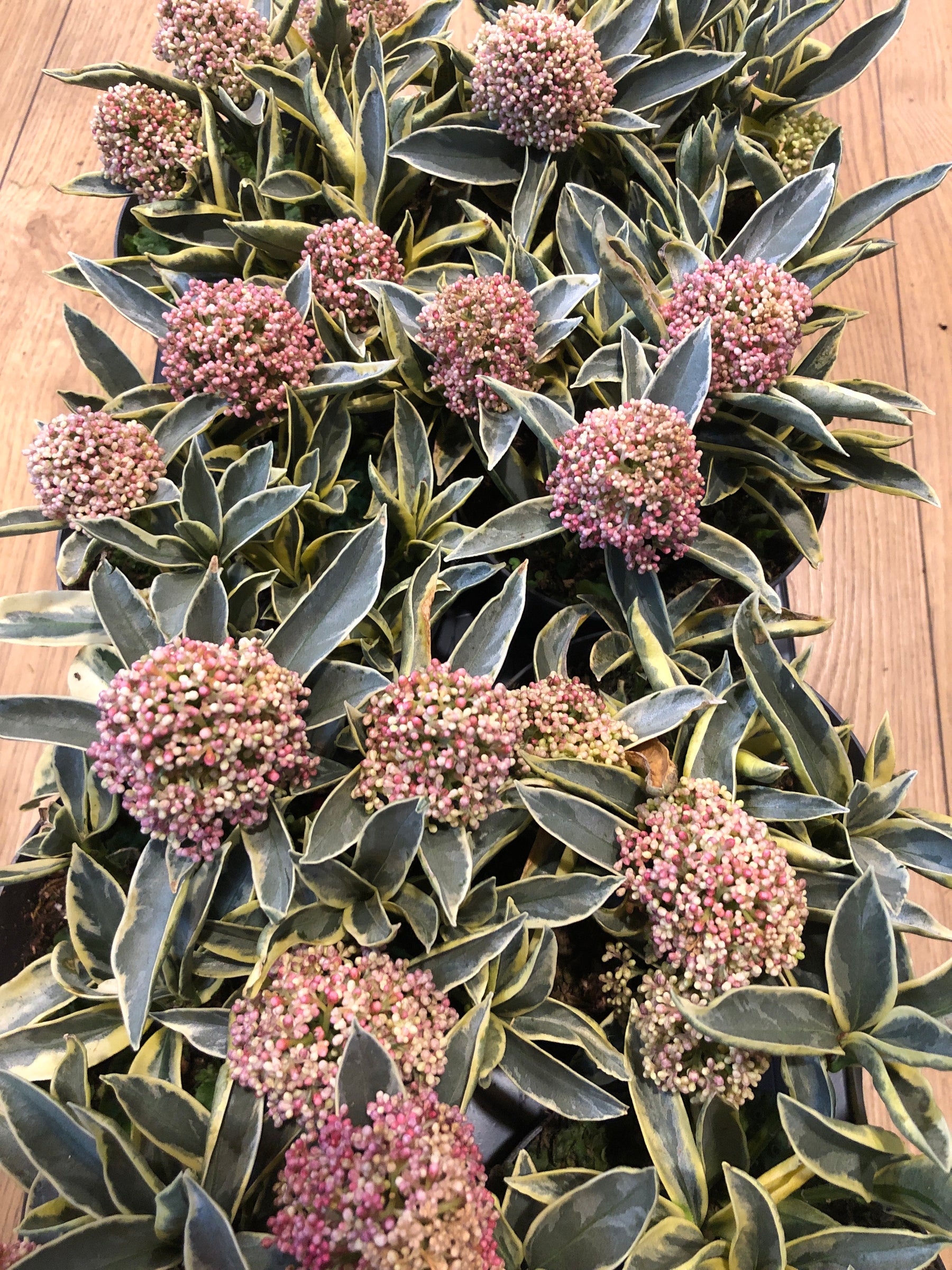 This fully hardy evergreen shrub packs a punch with its creamy margined leaves and bursts of dome-shaped cream flower buds. In winter, they turn fiery red before revealing fragrant white flowers come spring.
